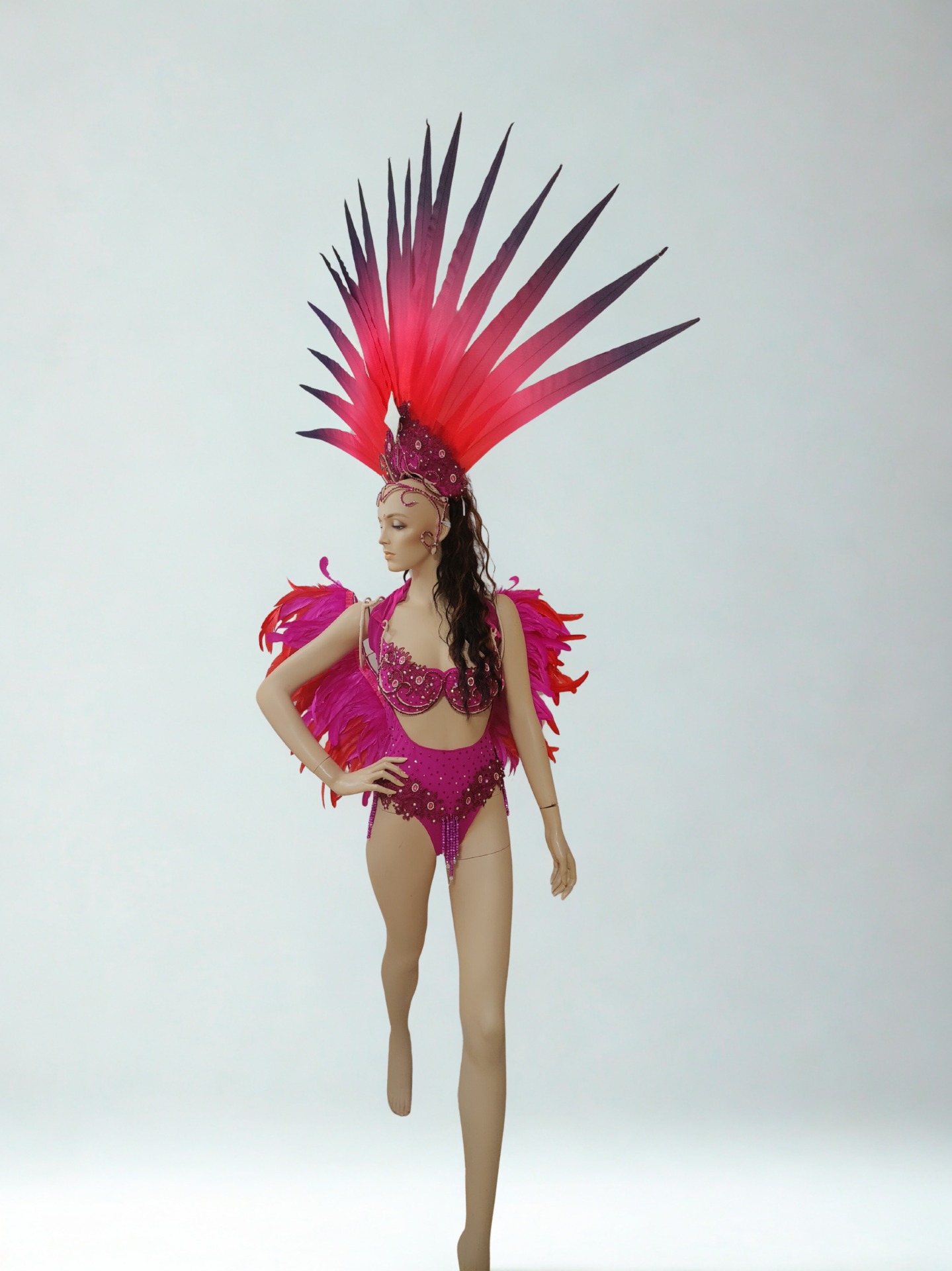 Tämä kaunis fuksian värinen samba-asu on tehty joustavasta kankaasta, joka on koristeltu sadoilla kimaltavilla strasseilla. Asussa on kaunis ykistyiskohtainen koristelu, joka korostaa lantiota.